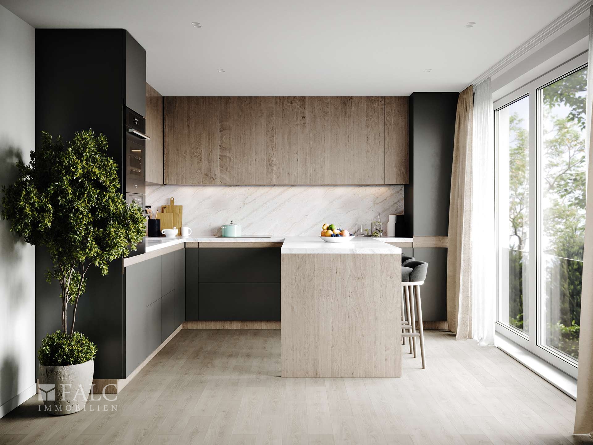 Der Wohnraum wird so konzipiert sein, dass sich Küche, Essplatz und Wohnzimmer harmonisch miteinander verbinden und den Mittelpunkt des gemeinschaftlichen Lebens bilden werden. Von hier aus wird der Zugang auf die großzügige Dachterrasse möglich sein, die mit ihrem Ausblick sowohl auf die Stadt als auch auf den Wald und ihrem Ambiente zu einem erweiterten Wohnraum im Freien werden wird.