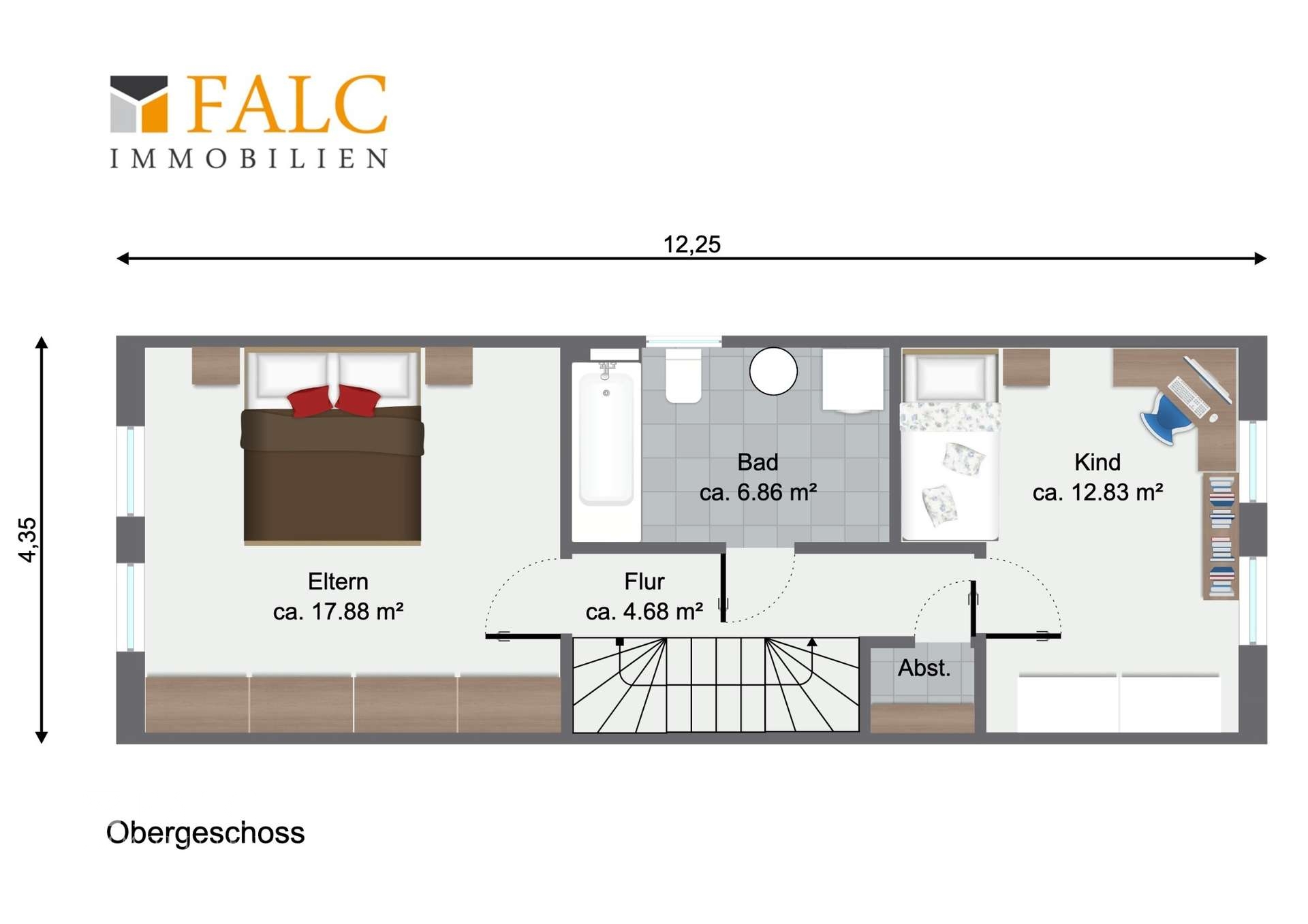 Im Obergeschoss stehen zwei gut geschnittene Schlafzimmer, ein großzügiges Badezimmer mit Tageslicht sowie eine Abstellkammer zur Verfügung. Das große Schlafzimmer im ausgebauten Dachgeschoss bietet zusätzlichen Komfort und Rückzugsraum – ideal als Elternschlafzimmer, Gästezimmer oder Arbeitsbereich.