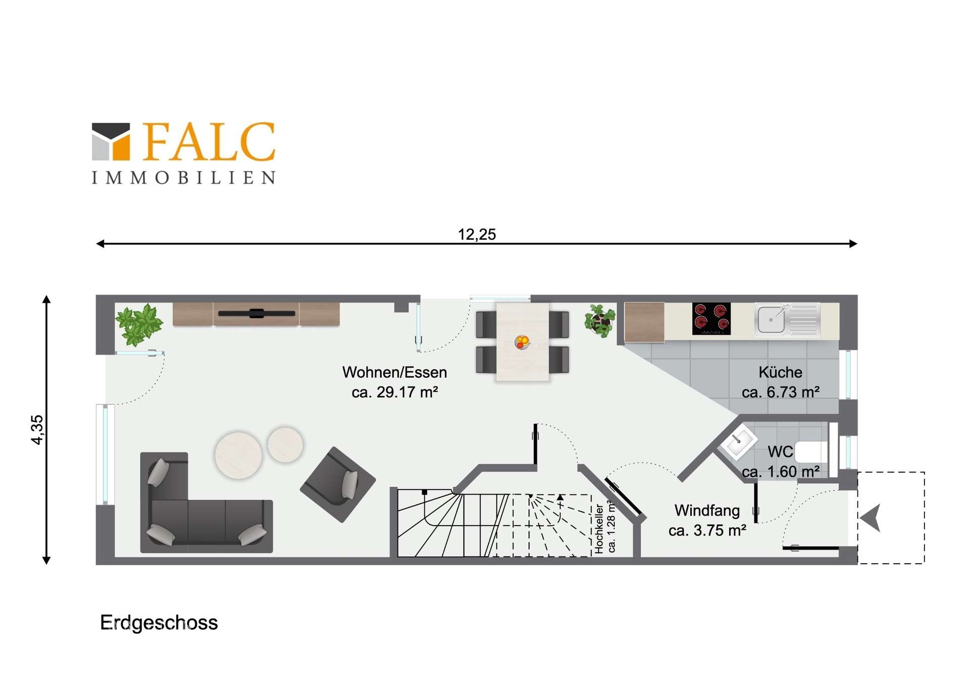 Über die einladende Diele gelangt man in den offen gestalteten Wohn- und Essbereich, der mit seiner Großzügigkeit und Helligkeit sofort Wohlfühlatmosphäre schafft. Von hier aus besteht der direkte Zugang zur Terrasse und zum liebevoll angelegten Garten, der ausreichend Platz zum Entspannen und für Freizeitaktivitäten bietet. Die offene Küche fügt sich harmonisch in den Wohnbereich ein und schafft einen modernen, kommunikativen Mittelpunkt des Hauses. Ebenfalls im Erdgeschoss befinden sich ein Gäste-WC, ein praktischer Waschraum unter der Treppe sowie zusätzliche Abstellmöglichkeiten.