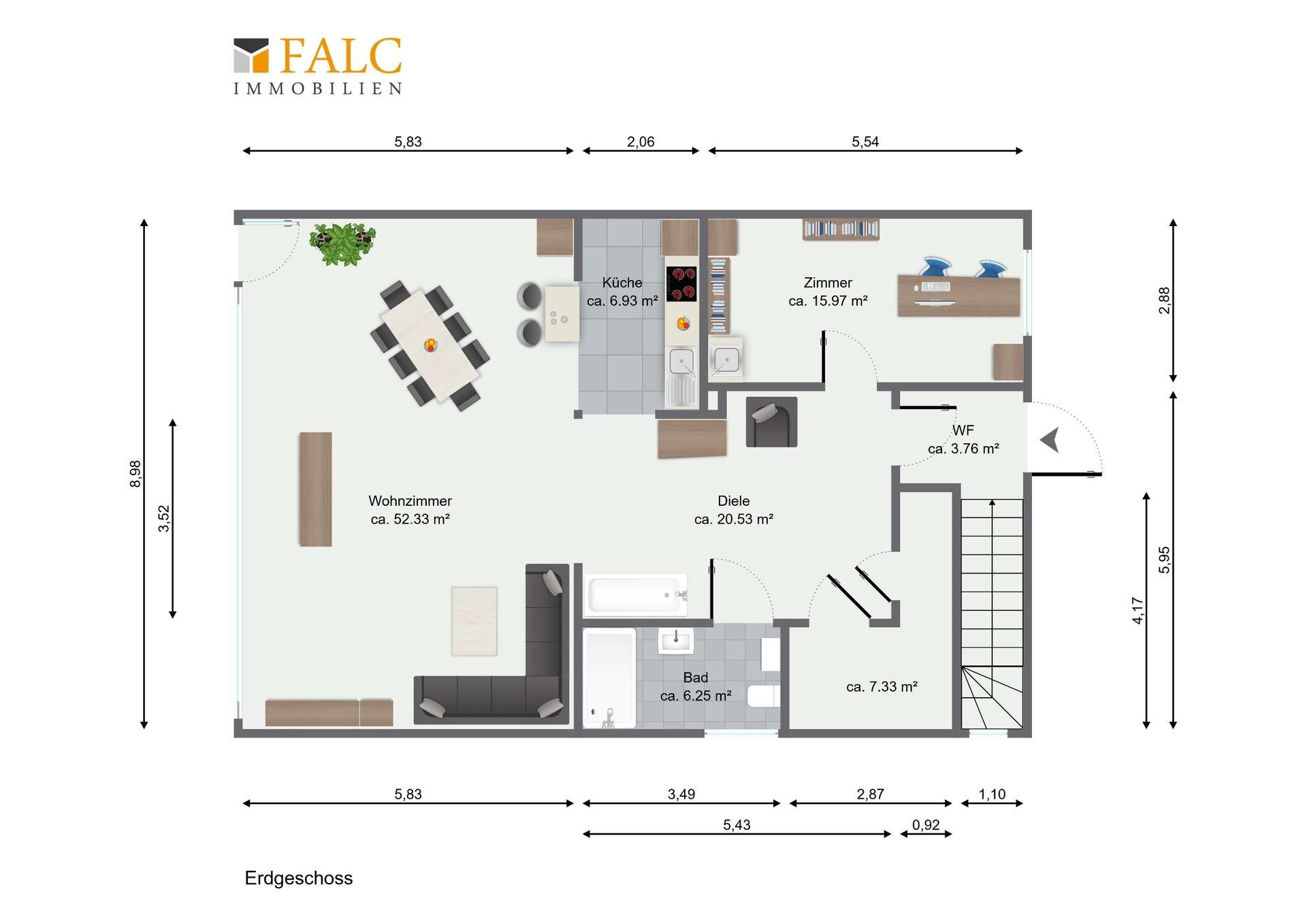 während das Gäste-WC zusätzlichen Komfort und Flexibilität bietet. Der offene Wohn- und Essbereich ist ideal für gesellige Abende mit Familie und Freunden.