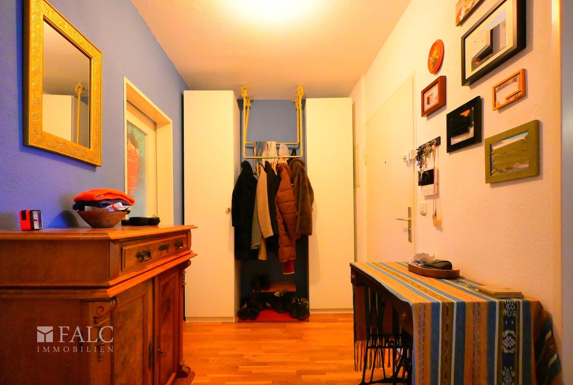 Beim Betreten der ca. 58 m² großen Eigentumswohnung aus dem Jahr 1950 empfängt Sie ein einladender Eingangsbereich, der ausreichend Platz für Garderobe und Schuhschrank bietet und direkt einen angenehmen ersten Eindruck vermittelt.
