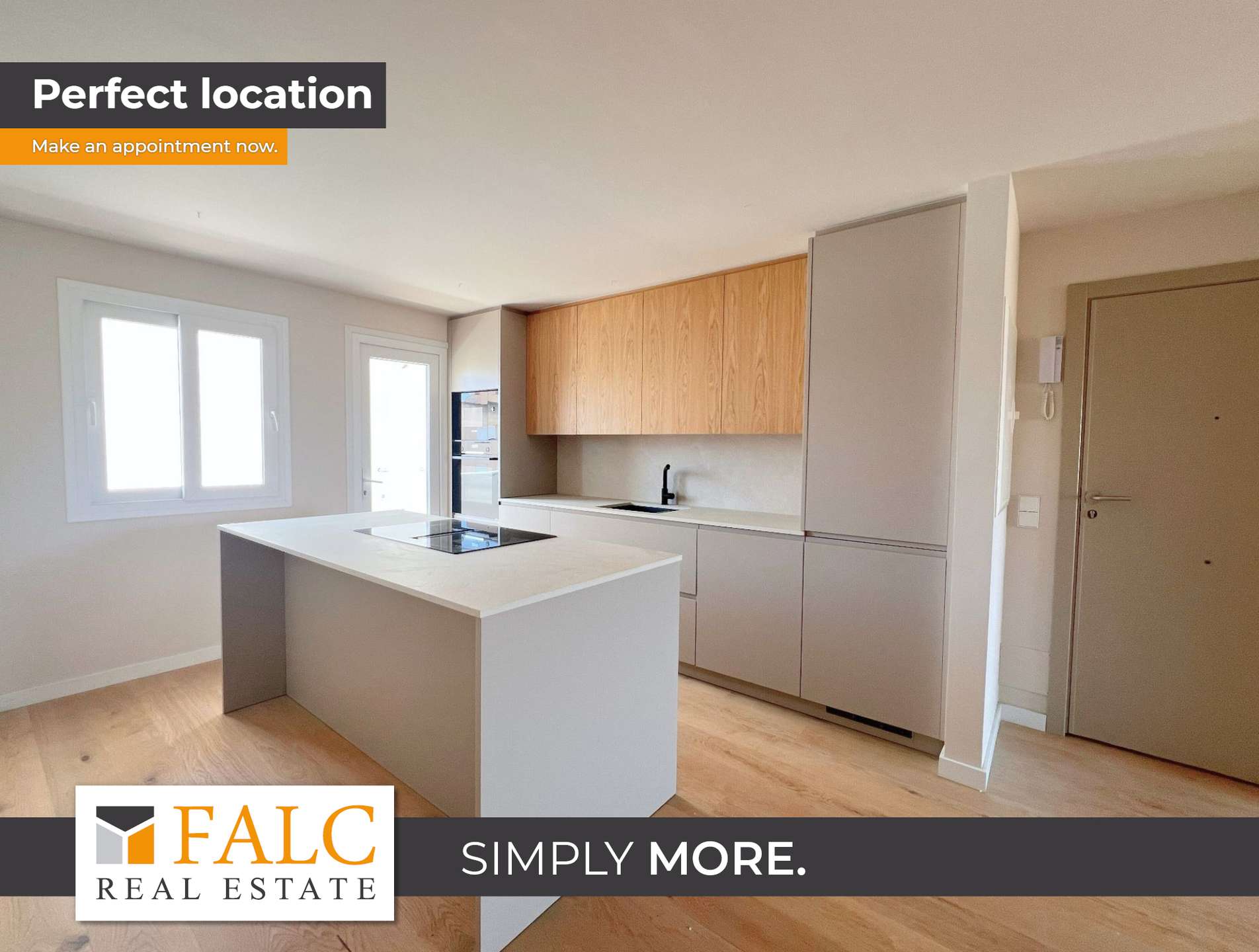 Die moderne Küche mit Zugang zu einem kleinen Balkon ist ein Highlight des Apartments. Sie ist mit eleganten Einbauschränken und hochwertigen Geräten ausgestattet. Eine zentrale Kochinsel bietet zusätzlichen Arbeitsraum und lädt zum gemeinsamen Kochen ein. Die Küche ist offen gestaltet und geht fließend in den Wohnbereich über, was eine gesellige Atmosphäre schafft.