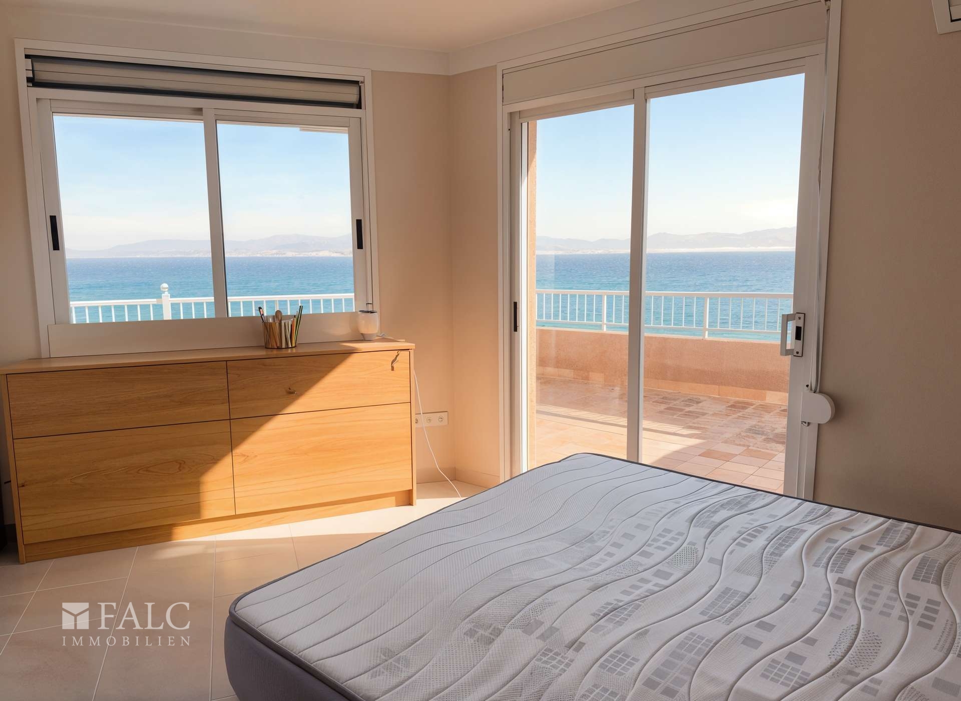 Das Schlafzimmer ist ruhig gehalten und ebenfalls sehr hell. Auch hier führen große Schiebetüren direkt auf die Terrasse, was morgens für Licht und Luft sorgt. Ein großer Einbauschrank bietet Stauraum, sodass der Raum ordentlich und flexibel möblierbar bleibt.