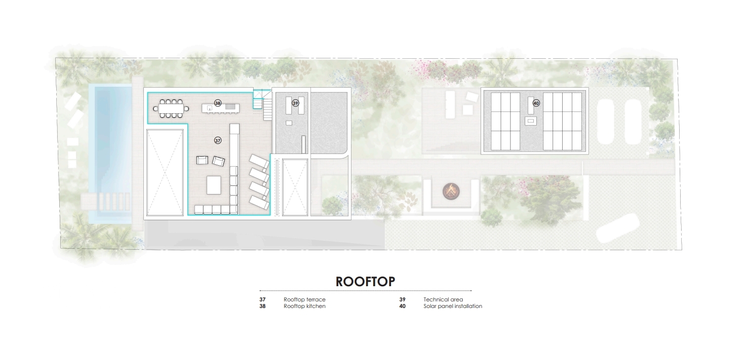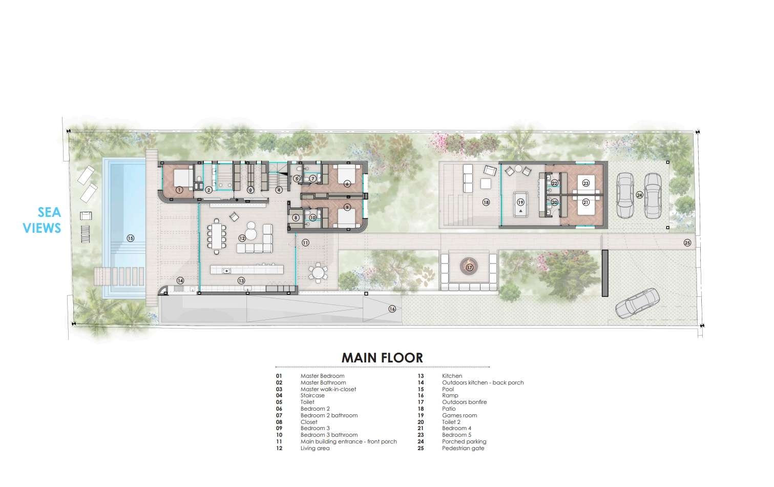 Ein Highlight sind die weitläufigen Terrassen sowie die traumhafte Dachterrasse mit BBQ-Bereich, die zum Entspannen und Genießen spektakulärer Sonnenuntergänge über dem Meer einladen. Zwei der Schlafzimmer mit eigenem Bad befinden sich in einem separaten Gästehaus und bieten ideale Rückzugsmöglichkeiten für Familie oder Gäste.