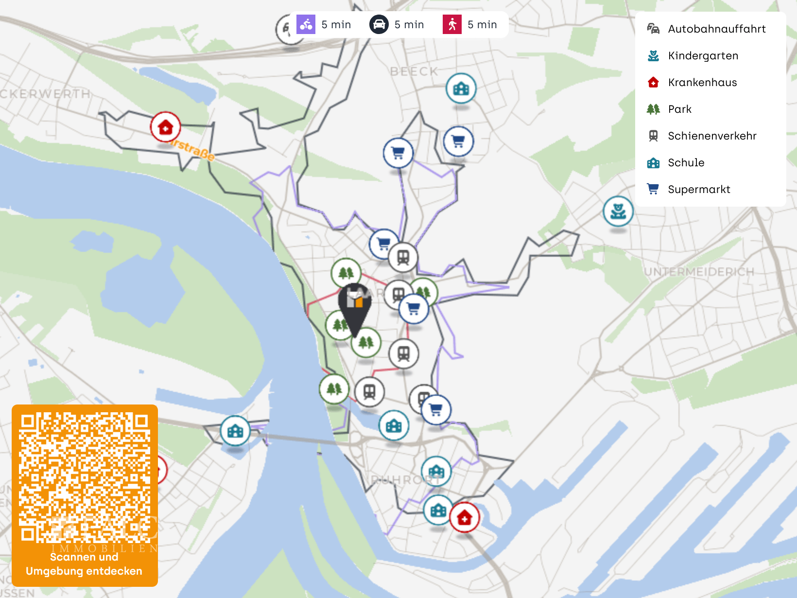Die individuelle Mobilität ist in dieser Lage sehr gut. Die Autobahn A59 ist in wenigen Minuten mit dem Auto erreichbar und bietet eine zügige Anbindung in Richtung Ruhrgebiet und Rheinland. Der Flughafen Düsseldorf ist ebenfalls gut erreichbar und macht die Lage auch für beruflich mobile Mieter attraktiv.