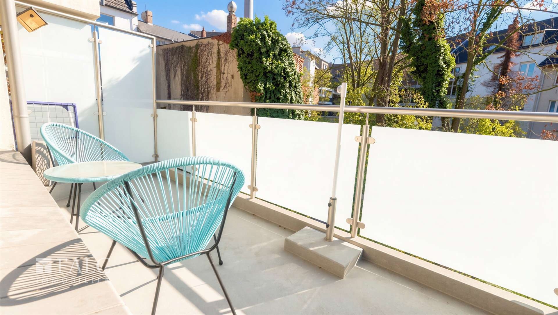 Balkon mit Glasgeländer und Sichtschutz