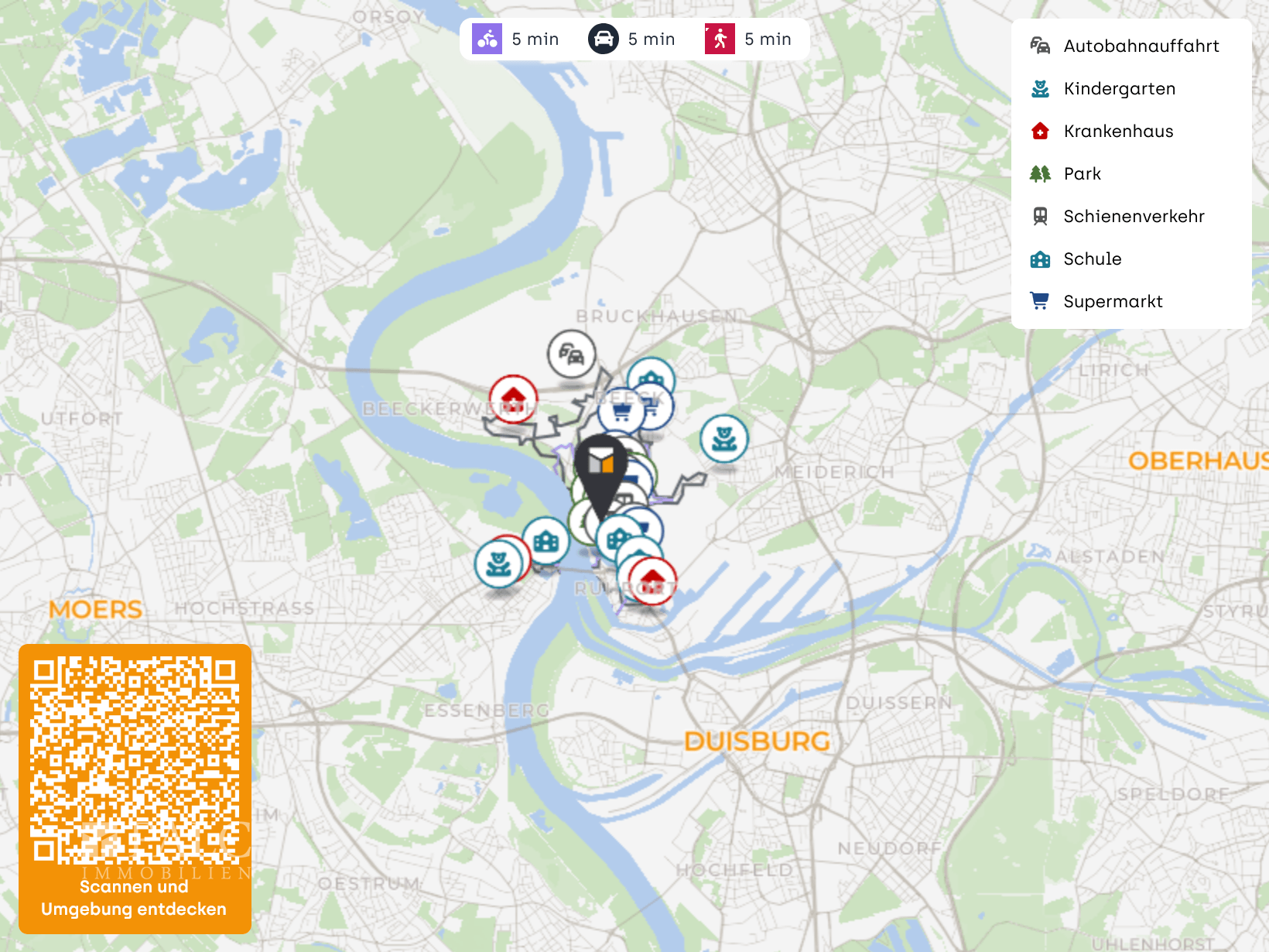 Die Immobilie liegt in einem gewachsenen Wohnumfeld im Duisburger Hafenstadtteil Ruhrort, geprägt durch die Nähe zu Rhein und Ruhr und eine solide, langfristig nachgefragte Mikrolage. Für Kapitalanleger ist vor allem die Kombination aus guter Alltagsversorgung, verlässlicher Anbindung und einem Umfeld mit stabiler Wohnnutzung interessant.