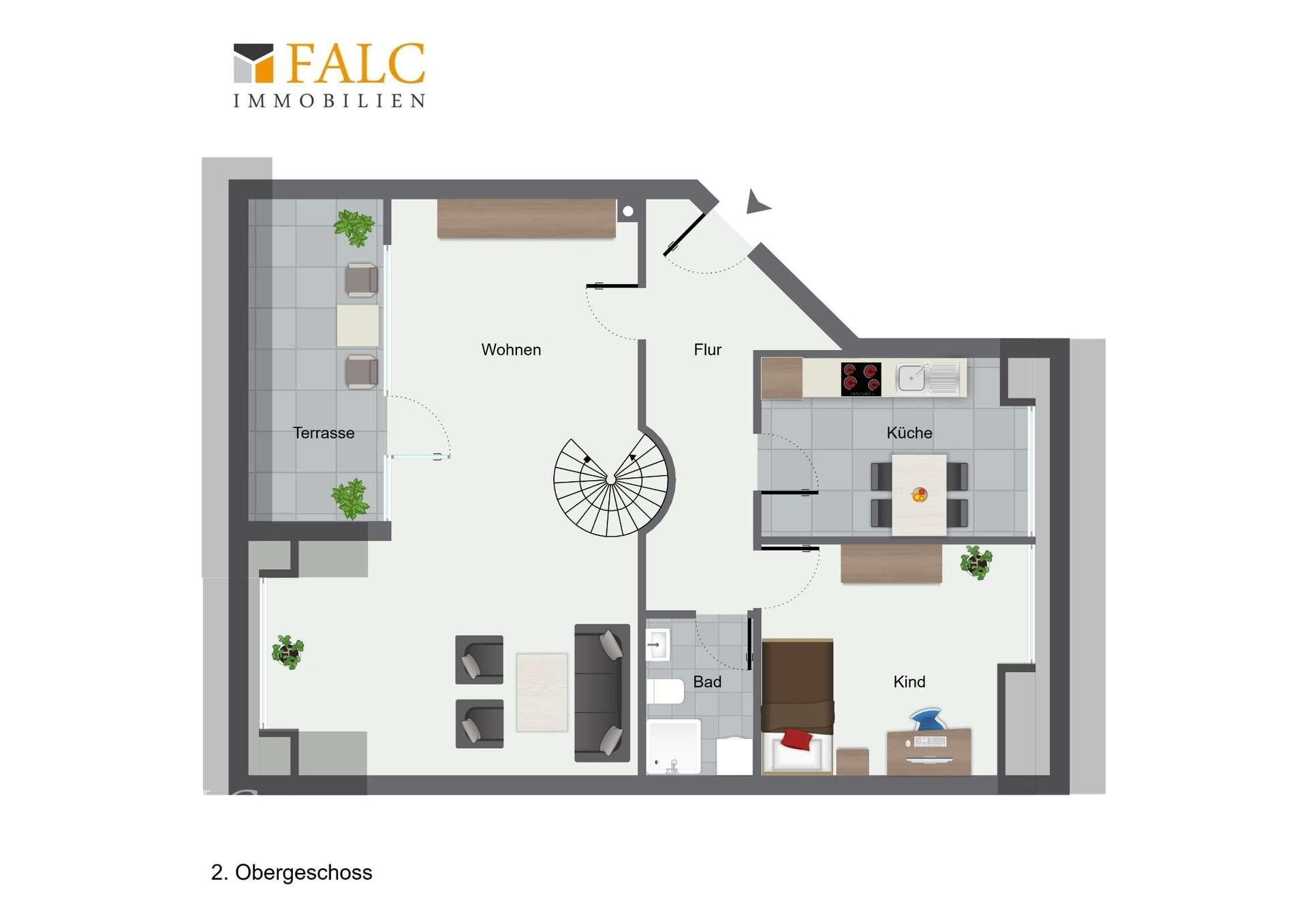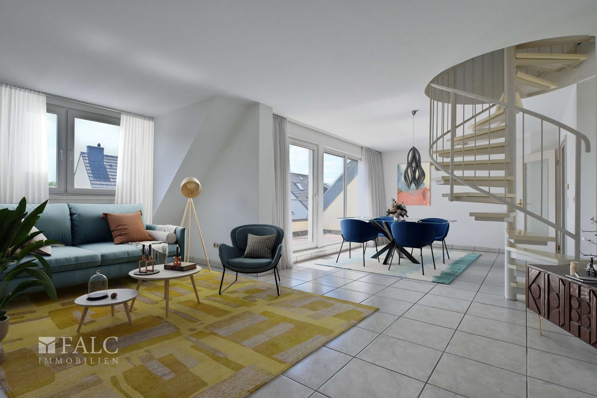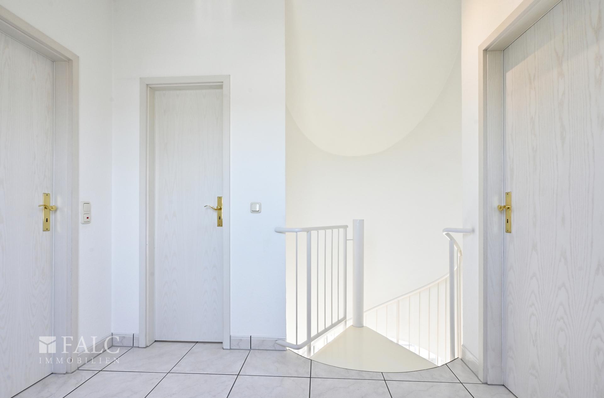 Die erste Ebene besticht durch ein großzügiges, helles Wohnzimmer mit stilvoller Wendeltreppe ins Dachgeschoss und Zugang zum sonnigen Süd-Balkon – ideal, um nach Feierabend zu entspannen. Die separate Küche bietet viel Platz zum Kochen und Verstauen. Ein modernes Duschbad mit Waschmaschinenanschluss sowie ein weiteres Zimmer, das sich perfekt als Arbeits-, Kinder- oder Gästezimmer eignet, runden diese Etage ab.
