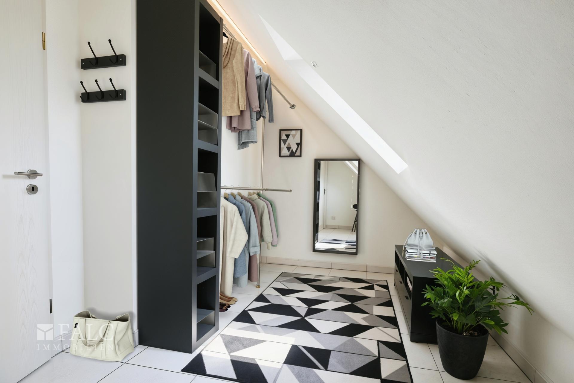 Im Dachgeschoss befindet sich der separate Schlafbereich mit angenehmer Rückzugsmöglichkeit. Das angrenzende Tageslichtbad mit Badewanne lädt zum Entspannen ein. Über die offene Galerie, welche genügend Platz für einen Arbeitsplatz bietet, ist zudem ein großzügiges Ankleidezimmer erreichbar – ein besonderes Plus. Alle Räume sind separat begehbar, was eine angenehme Raumstruktur und Privatsphäre schafft.